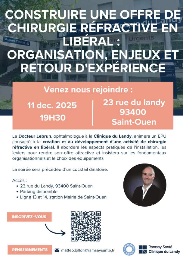 Le Docteur Lebrun, ophtalmologue à la Clinique du Landy, animera un EPU consacré à la création et au développement d'une activité de chirurgie réfractive en libéral le jeudi 11 décembre à 19h30.